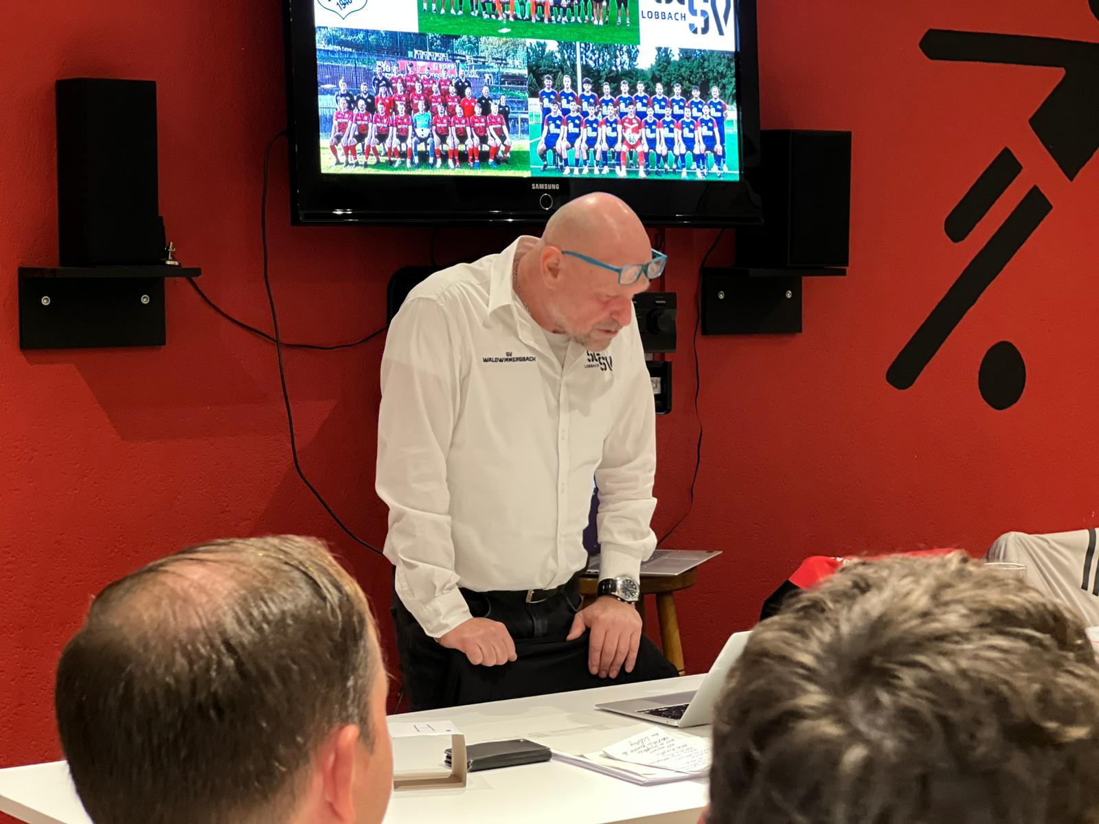 Verantwortliche Karl Werner von den Dingen wie sie sich seit Jahrzehnten im Fußball jährlich wiederholen. Spieler kommen und gehen und manchmal auch ein Trainer der wie unserem Fall seit 15 Jahren aktiv für den Lobbacher Fußball mit den versch. Jugend und Herrenmannschaften unterwegs und verantwortlich ist. Patrick Münkel wird uns im Sommer verlassen und in die weite Fußball Welt ziehen (Meister gib uns die Papiere (Strophe aus dem Vereinslied) um neue Erfahrungen zu sammeln in der noch jungen Trainer Karriere. Für Lobbach und alle Kicker war er bis dato ein Segen und schaffte auch den Aufstieg aus der Kreisliga in die Landesliga, in der wir uns im letzten Jahr sicher halten konnten. Er wird uns fehlen und doch müssen wir unsere Eigengewächse Jahr für Jahr voller Stolz ziehen lassen, denn was sie sind dazu hat unser Verein mit beigetragen was aus ihnen wird das müssen sie fortan ohne uns regeln. Wichtig ist aber das immer für sie Paltz ist und sie alle gerne wieder kommen dürfen. Abschied tut immer weh aber jedes Ende ist ein Neuanfang und so konnte Karl dann auch Timo Fischer unsere neuen 1. Trainer in der Versammlung begrüßen und vorstellen, wobei Timo seit mehreren Jahren beim SVW kein Unbekannter ist und auch bereits 4 Jahre Lobbach als Trainer in seiner Vita stehen hat.